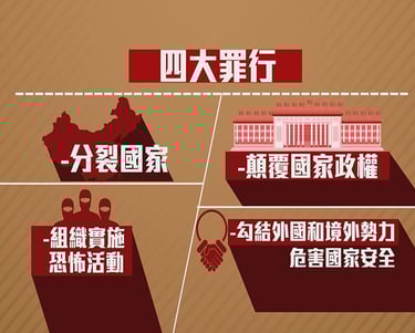 "National Security Law" officially came into effect in Hong Kong, and the scope of control has been extended to the world: sending to China, secret trials, designated judges, life imprisonment, etc. are allowed. The Hong Kong version of the National Security Law contains 6chapter 66 articles . The articles is rather vague. The promulgation of the "National Security Law " is regarded as the end of one country, two systems and the Chinese government's specific counter measures against the Anti -ELAB movement. The law has greatly expanded the powers of the central government and the Hong Kong government, and added 4 new crimes: "secession of the country", "subversion the power of country ", "terrorist activity" and "collusion with foreign or foreign forces to endanger national security " etc. . The maximum sentence is life imprisonment. The bill allows the Central Committee of the Communist Par ty of China to administratively direct the judicial system, with the National Security Office of the Communist Party of China appointed by Beijing as the ultimate source of power, and allows secret trials and sending people to China for trial. The scope of influence extends to Taiwan and the world. In addition, this law was included in the "Annex III of the Hong Kong Basic Law."