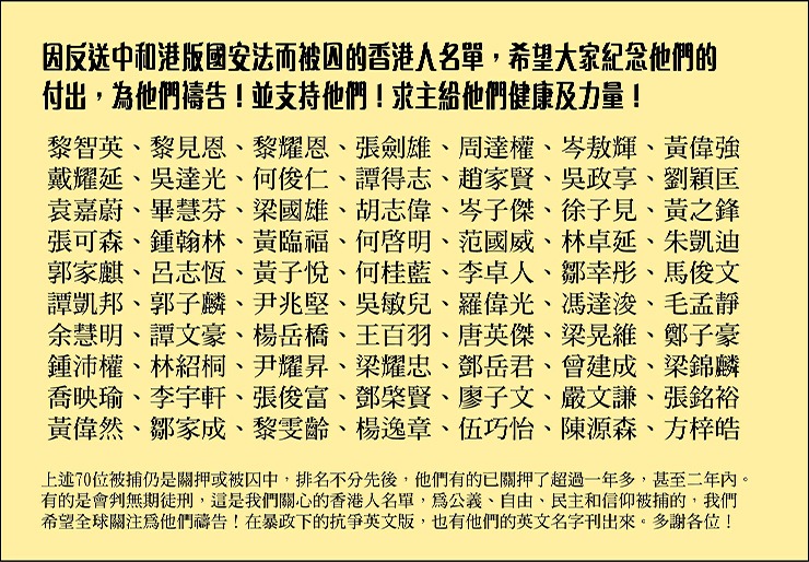 In the future, the persecution of most political organizations and trade unions by the Hong Kong version of the National Security Law, churches will also become to persecute in Hong Kong. Two churches have been forced to cease operations and disband. Here, I hope that there will be a relatively complete list of people detained in prisons for Hong Kong's democracy and justice. I hope everyone will pray for them.